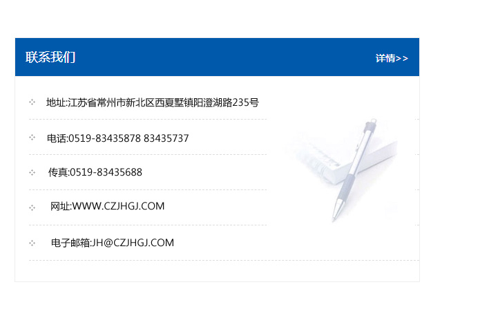 地址:常州市新北區友邦商務大廈1幢16、17層  電話:0519-85101652  傳真:0519-85112595  郵編:213022  網址:www_cz-jiayue_cn.qianlimafj.com  郵箱:xiajifengaa@163.com